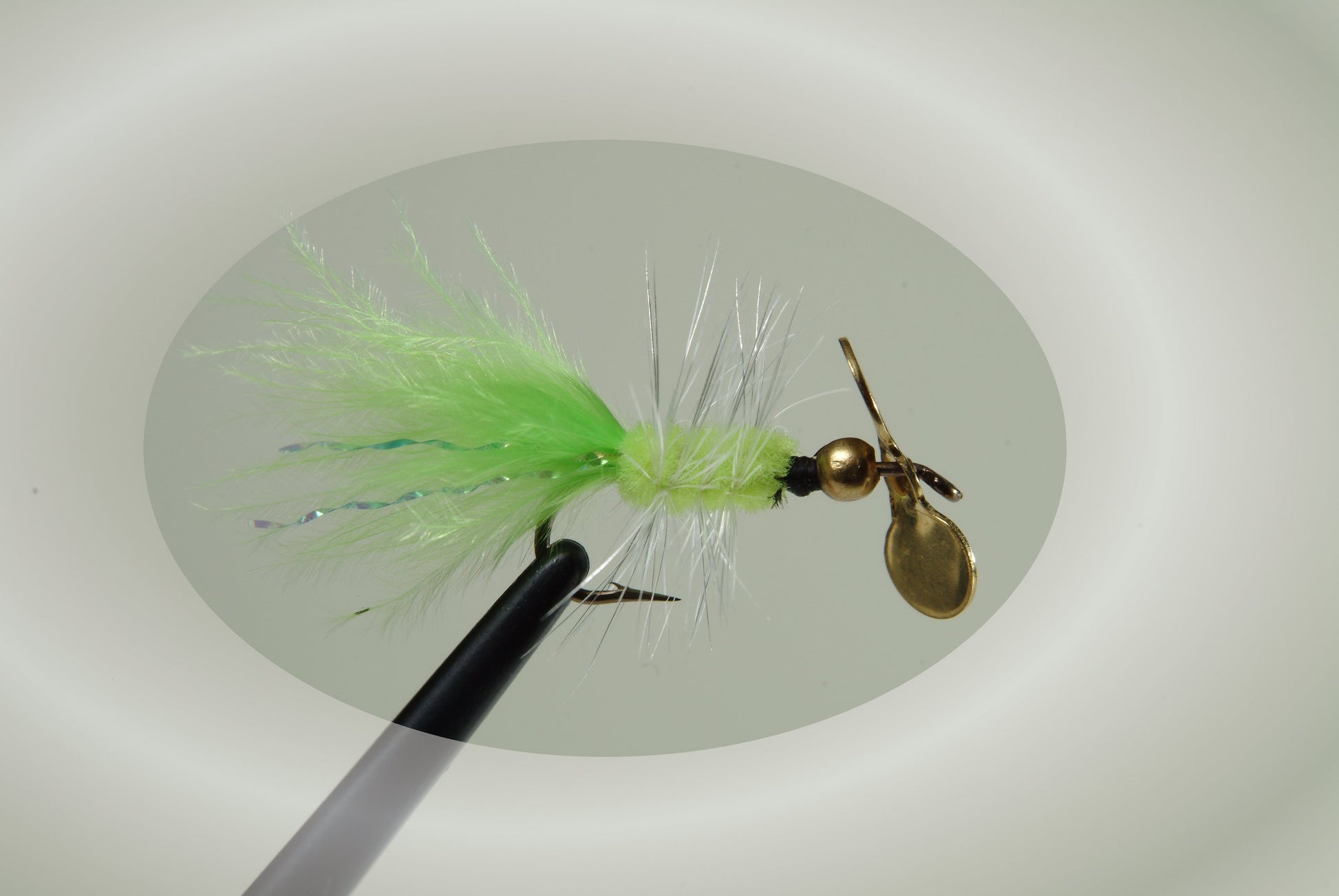 Chartreuse body, white hackle, chartreuse marabou tail with crystal flash, gold propeller and bead.