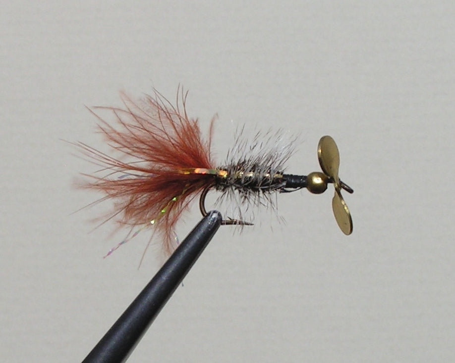 marabou tail with gold holographic tinsel, gold propeller and bead.