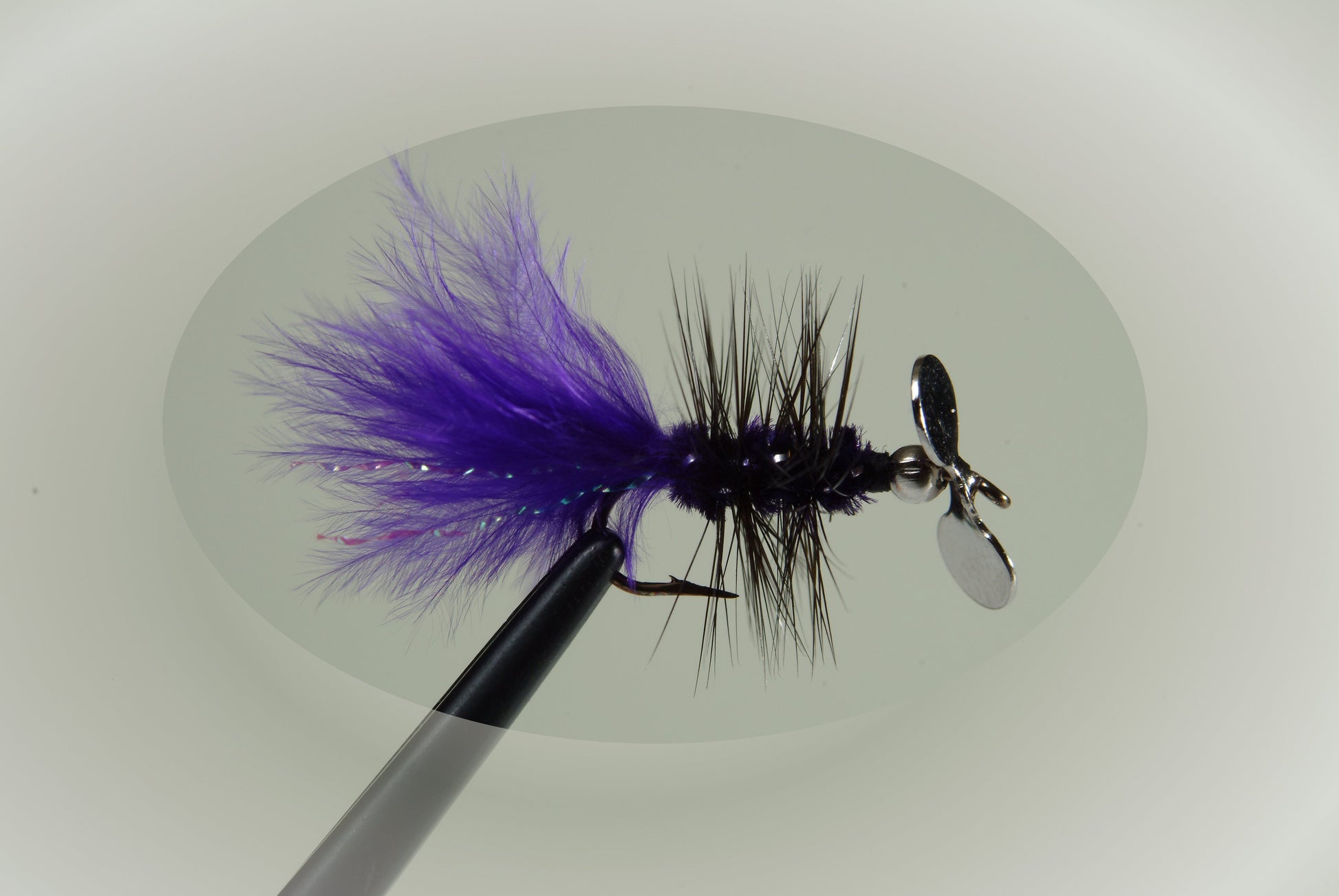 Purple body, black hackle, purple marabou tail with crystal flash, silver propeller and bead.