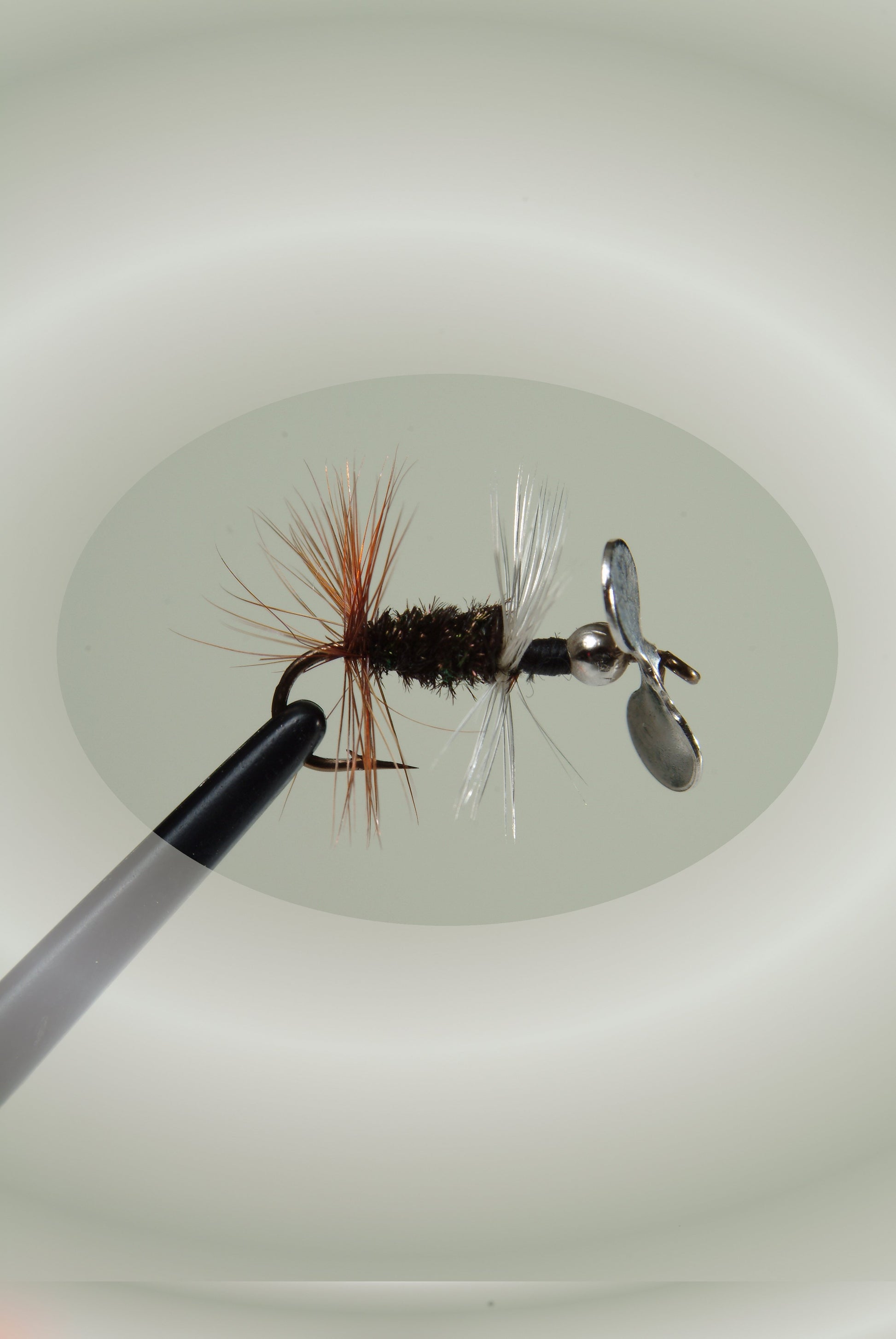 Peacock body, brown hackle in rear, white hackle in front, no tail, silver propeller and bead.